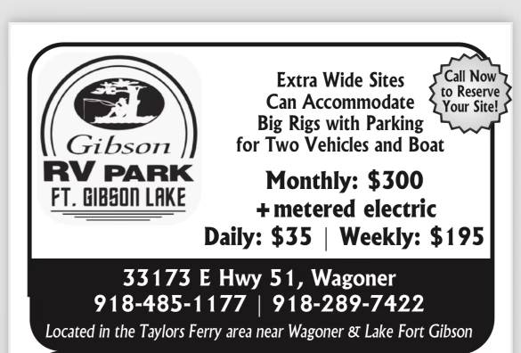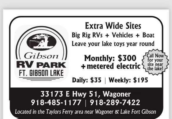 Nearby activities include ATV riding, fishing, horseback riding, public hunting areas, marinas, swimming and a state park. Gibson RV Park serves as a perfect hub for day trips to Muskogee, Tahlequah, Pryor, Okay, Broken Arrow, Chouteau's Amish country and the Tulsa metro area.