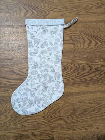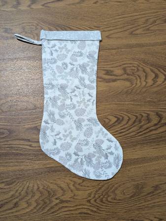 This is a handmade fully lined Christmas stocking with a hanging loop. The fabric has a white background with silver and gray pine cones, branches and leaves. The width at the top if approximately 6 1/2", and the width across the boot is approximately 8 to 8 1/2". The length is approximately 16".
