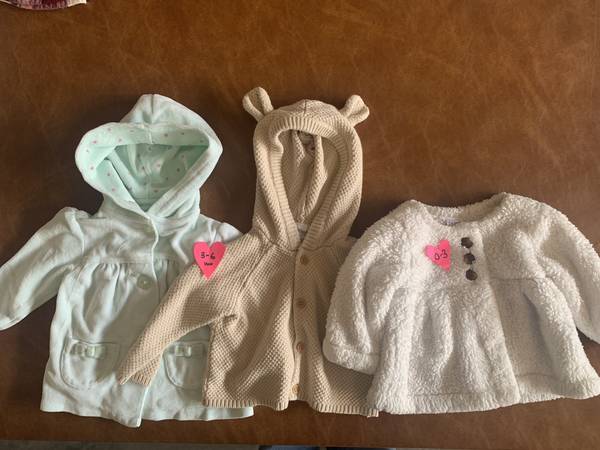 Bear push toy $20, rotating activity seat $20, soft blue boppy $5, baby clothes, all seasons, coats, outfits, pajamas, long and short-sleeved onesies, lots more than pictured, size 0-2T, girls and boys, 1 pair black jeans size 3T, $1 each piece or $2 outfit, swaddles and sacks, crib sheet, shoes galore, all like new.