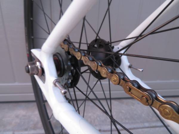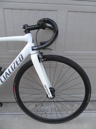 Excellent condition fixie bike! Size 56cm/Large based off Specialized's Allez Sprint geometry. Frame has only very minor signs of wear (see pictures). Includes a new condition Specialized Aerofly Carbon handlebars (Size 40cm/400mm) Specialized Carbon fork has slight different shine of white (see pictures). Both wheels are true and tires show normal wear and usage (see pics). Currently has a Shimano/Tektro front brake installed but can be removed in a few minutes. Rear hub is flip-flop and comes with a 16t 1/8" cog and a Soma Fabrications 15t 3/32" cog.