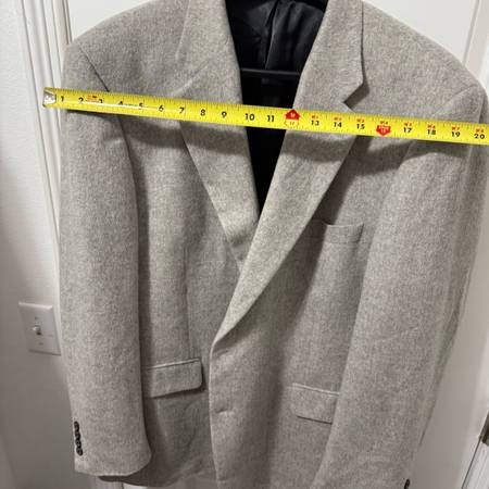 light gray, camel hair, two-button blazer, notch lapel, tailored fit, formal jacket, smart casual, business attire, classic design, pre-owned