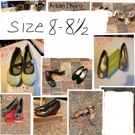 Shoes sizes 7, 71/2, 8, 81/2, purses, jackets, make-up, hair accessories.