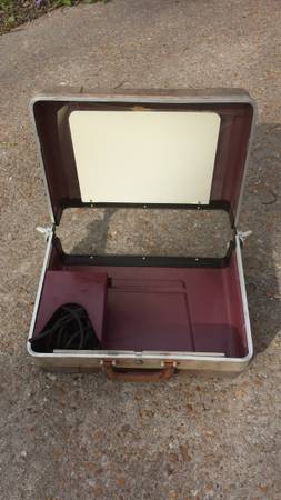This is a portable 35mm filmstrip projector with built-in record player for sound to accompany the filmstrips.
