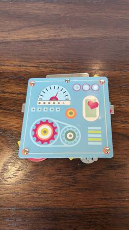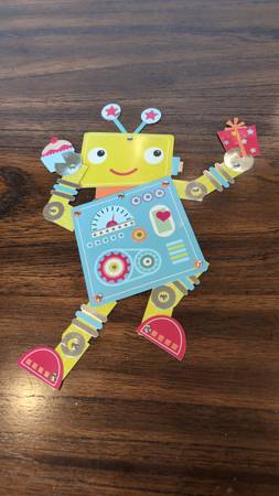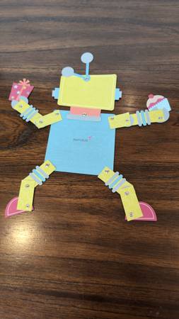 The product is a colorful and adorable Papyrus brand greeting card featuring a robot holding a cupcake in one hand and a present in the other. The Robot has moving parts that are fun to play with and move in various poses. This blank card is perfect for celebrating birthdays or Valentine's Day, making it a fun and unique way to send warm wishes to loved ones, children, adults, boys, girls, and kids at heart. The multicolor design adds a playful touch to the card, making it a entertaining choice for any occasion. The envelope is a Quality Park Brand invitation envelope. Comes from a pet free and smoke free home.
