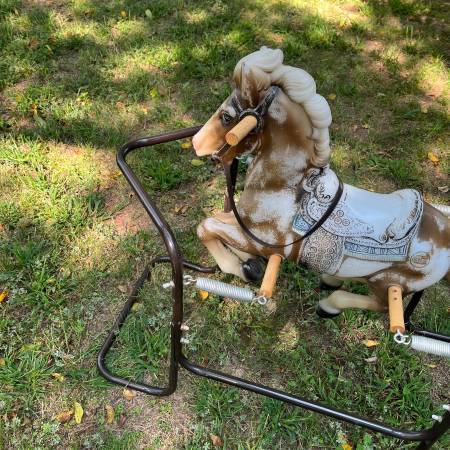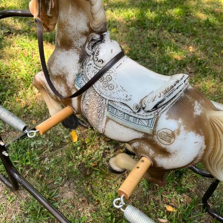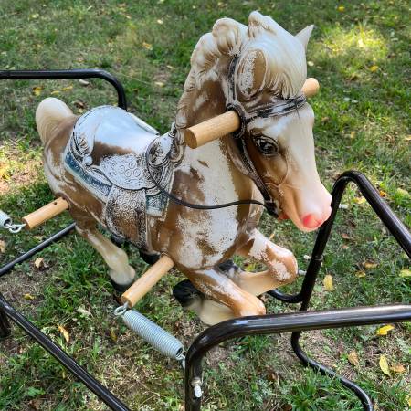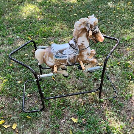Vintage Spring Bouncy Horse, unable to find this exact horse, maybe Wonder horse?? from the 1980’s?? This is a ridable bouncy horse for a small child but would also make an awesome store or home display!! Horse measures approximately 35” high from ground, 25” wide, 24” high and 7.5” deep, frame measures approximately 42.75” wide and 18.75” deep, in excellent pre-owned condition structurally, no breaks or cracks, does have paint loss, see all pictures, any wear is consistent with age and use, only $35, listed on multiple sites, shipping not available, porch pickup off Rupple/Weir, Fayetteville, AR, cash or Venmo. Thank you so much for looking!!