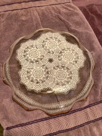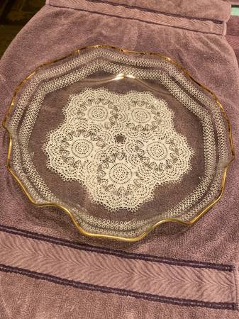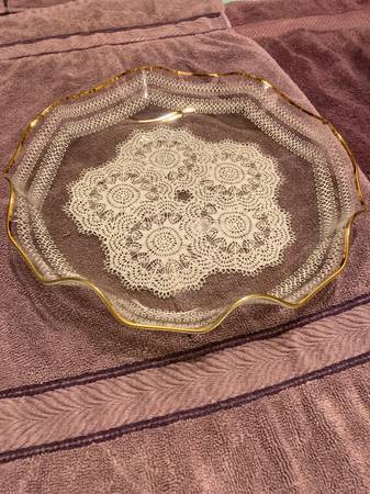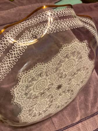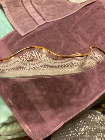 Chance Bros.made in England clear or white whatever you want to call it blown glass lace doily gold glass ruffled dish with gold trim hand blown glass Fiesta line. Beautiful no chips, breaks or...
