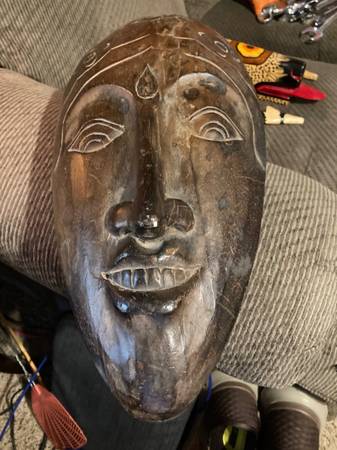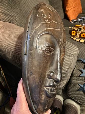 Hand carved wooden tribal mask box. Associated with the Chokwe people of Angola and the Congo