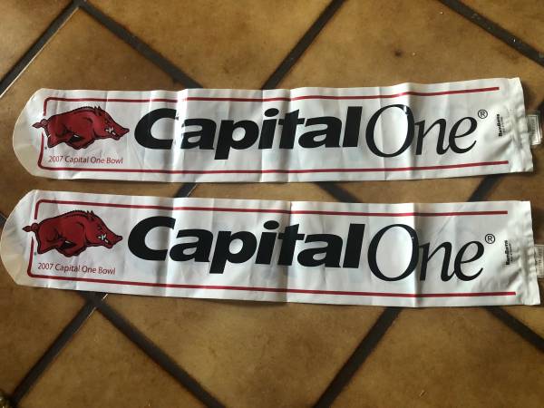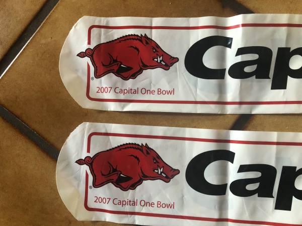 Pair of Bam Bam noisemakers 2007 Capital One Bowl New Pair of retractable 9x12 Razorback flags 1995 Arkansas vs Texas January 5, 2010 Spirit towel 1991 PomPom UNLV vs U of A February 10, 1991 Appear...