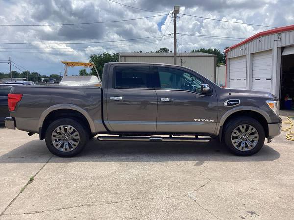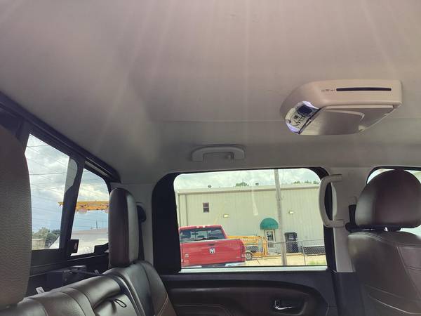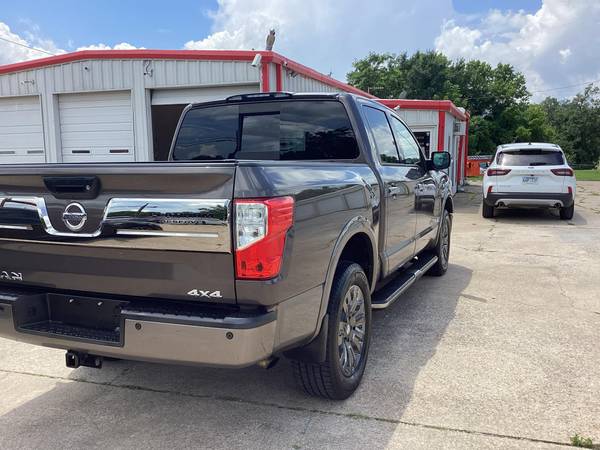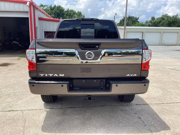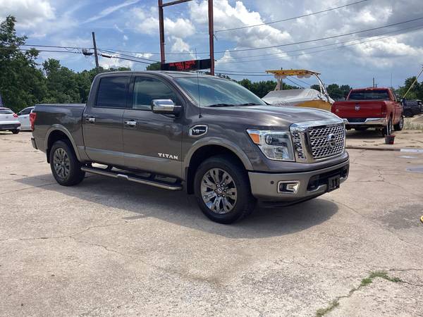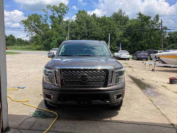 We are selling 2017 Nissan Titan Platinum Reserve 5.6L V8, DOHC 32V, 4X4, Crew Cab, automatic transmission. This vehicle is in excellent condition and super clean. Has navigation, backup camera, USB/AM/FM/CD/AUX/BT/Sirius XM, Nissan Connect, Rockford Fosgate sound system, all leather tan on black, heated & cooled seats, heated steering wheel, heated driver & passenger mirrors, driver memory seats, power windows, seats, doors, power tilt, cruise, power rear window, rear entertainment, cargo lamp, hard backflip cover, spray on bed-liner, fixed running boards, two toned alloy wheels, new tires, sport fog lamps, HID headlamps, tow package. This truck has all the luxury one could have. Runs and drives perfect. Just serviced. NO mechanical issues. Clean title and Carfax with 143K miles. Selling for $22,999. Call or text Dunc's Discount Auto at 479-422-0588 or 479-225-2020.