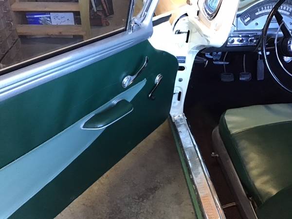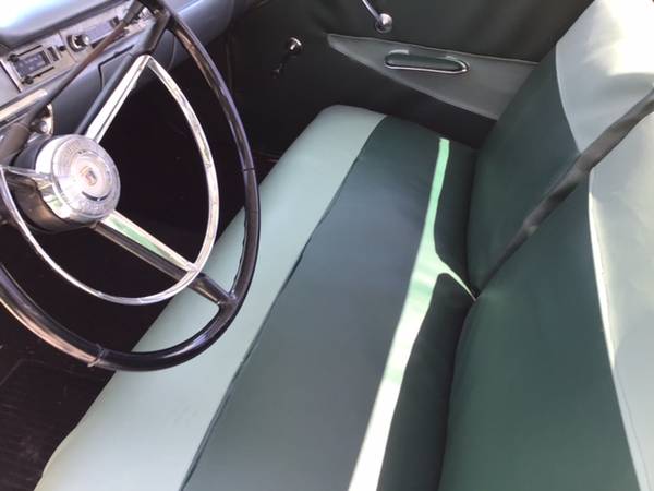 New door seals, carpeting,headliner and seats done in two tone green vinyl. Car built with lifeguard package, which were safety features which included deep dish steering wheel,double grip door latches , sun visors and more.