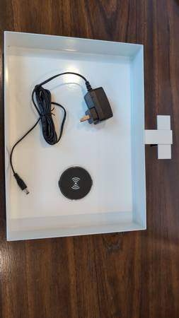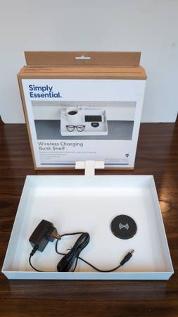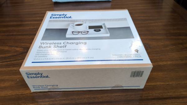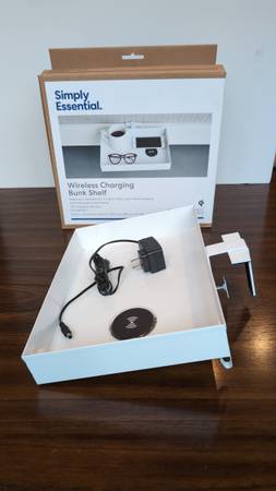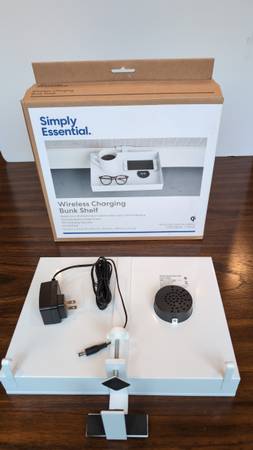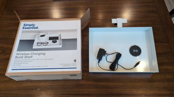 The Simply Essential Wireless Charging Bunk Shelf keeps your smartphone or tablet within reach while charging. This clamp mount can be easily attached to a bed frame or desk, providing a convenient and organized charging solution. The glossy white finish and LED charging indicator add style with function. This Qi certified wireless charging pad is a practical and efficient way to charge and store your devices. Great for dorm rooms and bunk beds. Never used. In box. Comes from a pet free and smoke free home.