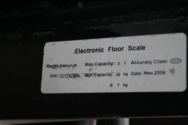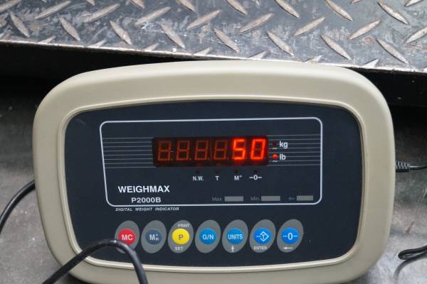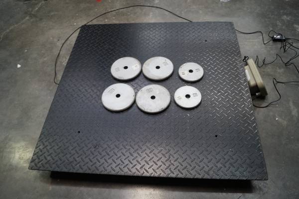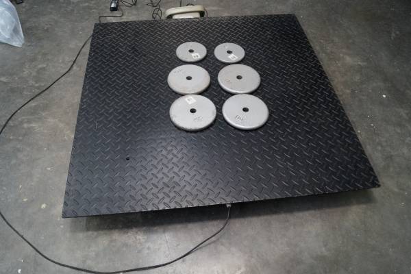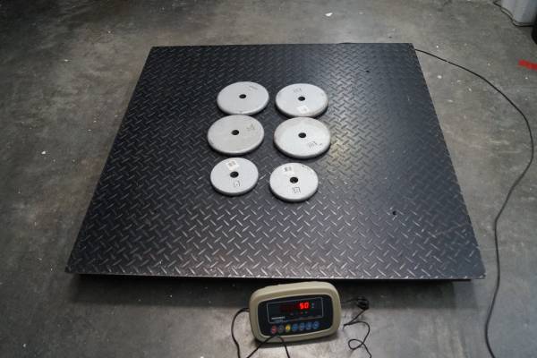 Have a used floor scale with a 4 foot by 4 foot platform with a Weighmax P2000B head. Pictures show 50 pounds of weights on it and it ready correctly.