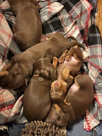 Beautiful Chocolate and tan Weiner pups! Only three boys left, one is super light and might be an Isabella color which is pretty rare. Mini, miniature, dachshund, mini dachshund, weenie, weiner dog....