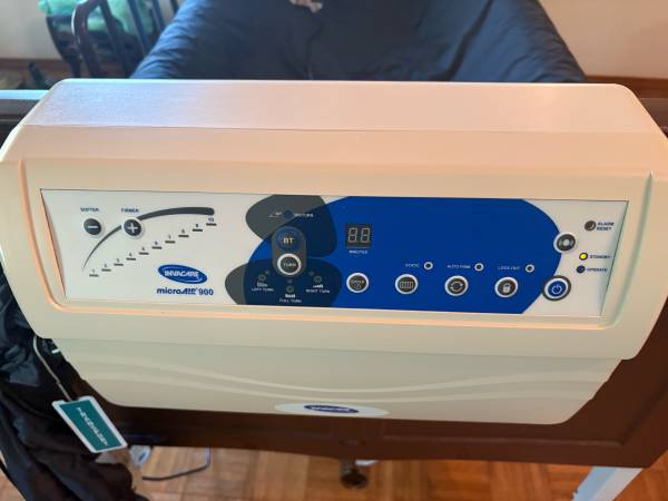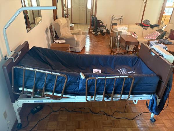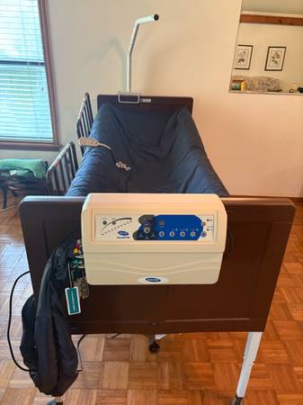 Hospital Bed with Invacare 900 Air Flow Mattress System. Complete with electric operation, guard rails, backup air pump, land lift bar. Only 8 months old. Originally $4000.