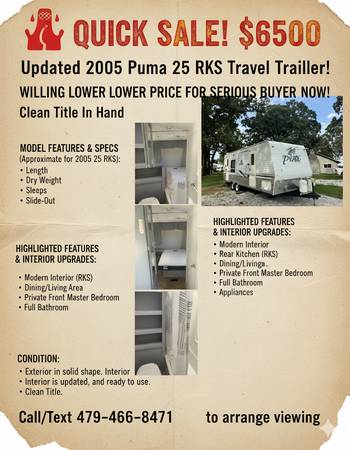 MUST SELL BY WEDNESDAY NIGHT! Price is firm for a quick, cash sale. This travel trailer is priced to move and ready for its next adventure!