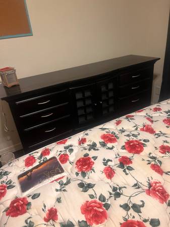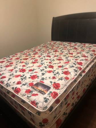 Queen size bed with headboard and foot board and including mattress and box springs, dresser and end table.