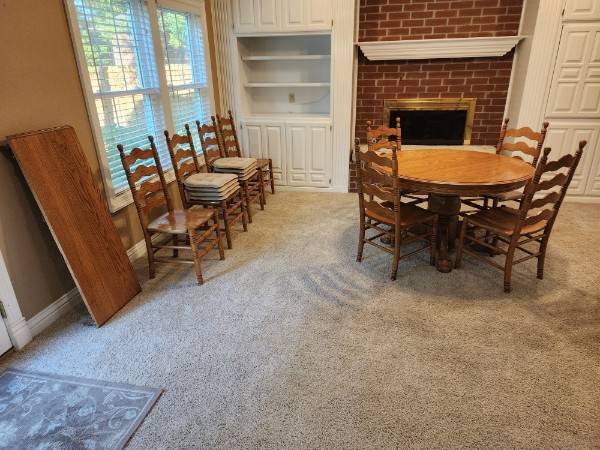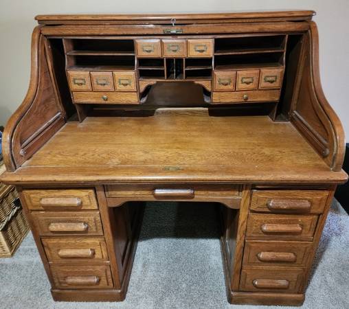 Lots of great furniture, including an elegant solid cherry lighted hutch, a Klaussen contemporary ivory chair, a beautiful carved walnut pedestal side table with marble patterned insert, rugs, lamps, wall art, a North Carolina solid oak table with 8 chairs, a leaf, and chair pads; side table, a Maple bed frame, an impressive Hooker three-piece TV entertainment center, and a gorgeous vintage antique rolltop desk with incredible detail. Christmas items. Lots of beautiful dishes for entertaining, everyday dishes, serving and cooking items, books, decor items, etc. Come by 2762 E Birdie Dr. in Fayetteville to see everything for yourself. Everything priced right for prompt sale and in good condition.