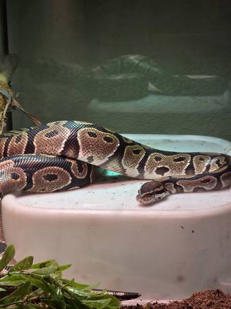 2 year old friendly female ball python. Hissy Elliot has never bitten, easy to feed, loving cuddle noodle needs a new home. Everything in her set up goes with her. She is 6 inches in diameter, and almost 4 ft long. Easy to handle. 918-931-72threezero
