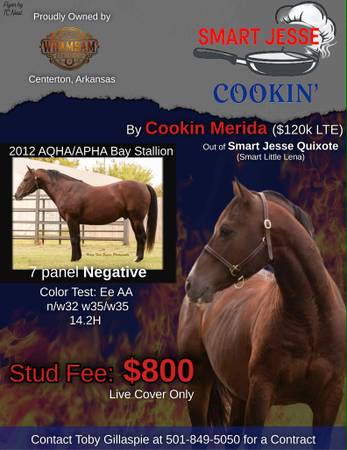 WhamBam Stallions !!!!Smart Jesse Cookin "Jesse" a 2012 APHA/AQHA Bay stallion. This stud is bred to eat up a cow. An own son to Cookin Merada (120k LTE) by Meradas Money Talks, a million dollar sire. Out Smart Jesse Quixote a money earning mare by the legendary Smart Little Lena. Both grand dams are proven money earners as well. This guy is royally bred with 3 of Doc Bar's greatest sons on his papers. Doc Quixote, Doc Olena and Docs Hickory. He stands 14.1h. 6 panel n/n and LWO n/n so safe for Frame Overo mares. color test is EeAA n/w32 w35/w35. This guy is bred to make hotrods for the show arena. he has the best mind, manners and personality.