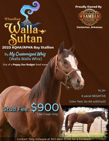 Whambam Walla Sultan "Sultan " 2023 AQHA/APHA Bay Overo stallion . This fella has it all with breeding, brains and athletic build. He is by My Customized Whiz . Unshown due to injury as a foal but already has produced earnings. Grandson to the legendary top producing Walla Walla Whiz. Maternal grandsire Mega Powder is an earner and producer in his own right. Sultan stands 14.1 h tall . 6 panel nn LWO nn w20/w20. Proudly standing at WhamBam Stallions for 2026 breedining season.