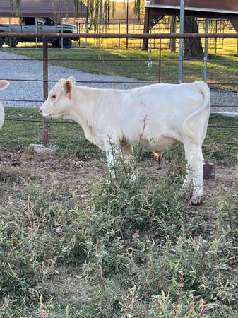 A really nice set of Charolias bulls ready to go. 5 and 6 months. Been wormed and given first round of vaccines when we pulled them off moms. Out of registered stock. Bulls can be registered. Born and raised here on our farm.
