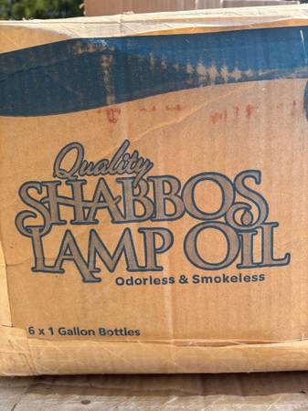 Five cases of Shabbos Oforless and Smokeless Lamp Oil, each containing six individual gallons of oil, all unopened.