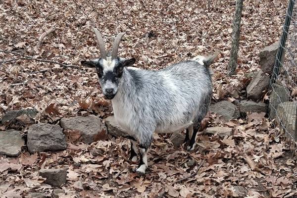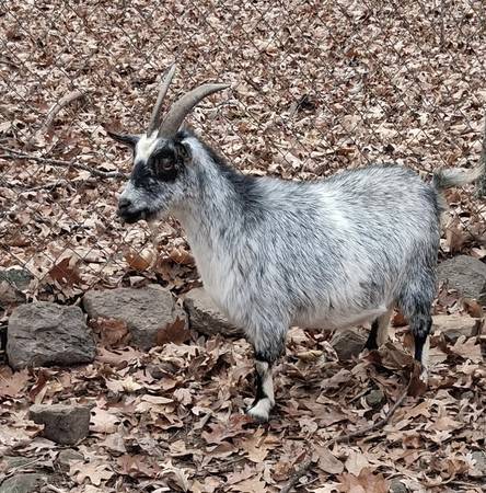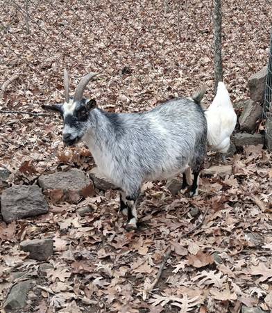 Silver Nigerian dwarf doe. We believe she is over five years old. She has had several sets of twins- never had a single. Good mother. She has not had babies this year but could be pregnant. She is skittish. We have milked her but it wasn’t easy. She has an uneven bag.
