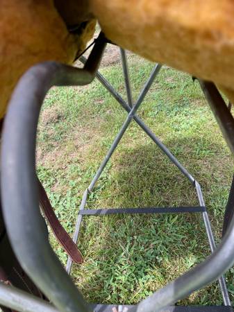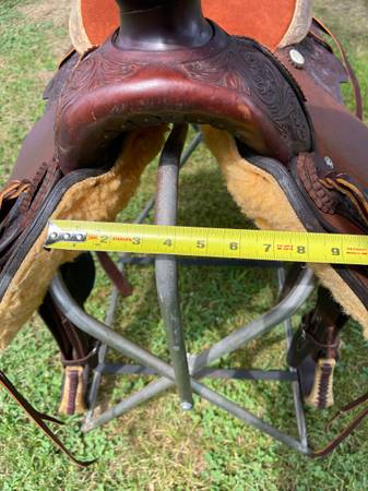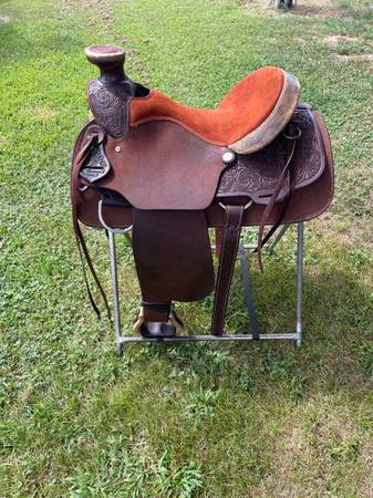 I really don’t think this saddle has been on a horse, but if it has it’s only been a couple times. NRS makes a great saddle very strong Rawhide cantle & stirrups. Roughout fenders, beautiful carved jockeys, padded seat ready to work. The Tack Shak. Shipping available at Buyers expense.