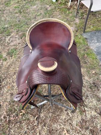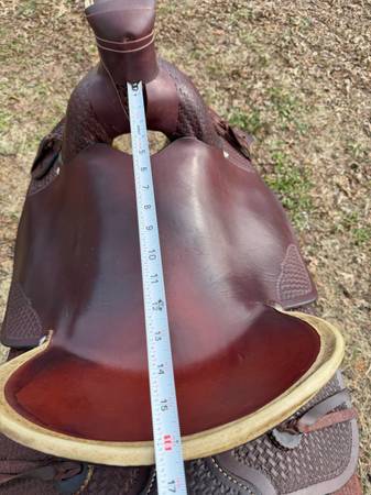 This 16” Dakota Ranch saddle (Afork) is cleaned and ready to go to work. Complete with back cinch & aluminum stirrups. Good wide gullet to fit those wide backed horses & mules. Stout in every way and clean underneath. The Tack Shak. Shipping available at Buyers expense