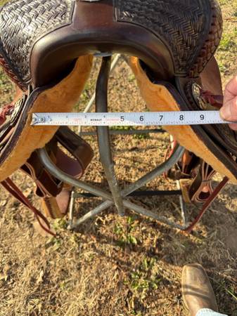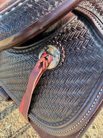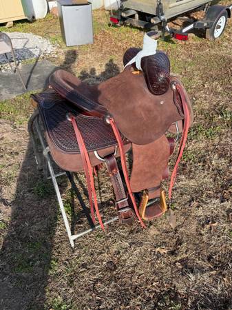 New SRS Chocolate Roughout 15” seat 7&1/2” gullet. Never been on a horse, super nice two tone chonchos Mulehide wrapped horn, this saddle has a unique basket stamp on the swells & jockey’s, lattice laced swells, with Rawhide wrapped horn and stirrups. Compete with back cinch ready to go to work. The Tack Shak shipping available at Buyers expense