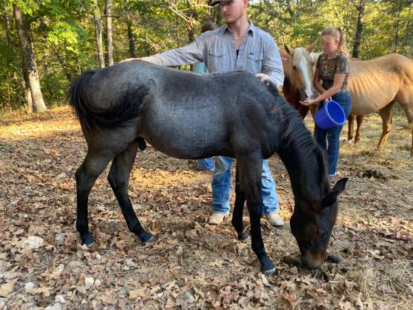2025 Bay Roan stud colt, out of a Homozygous Blue Roan Hancock stud. Dam is a Grade, 10-12 yr old proven brood mare. This colt is friendly and has been handled often. Gonna be a head turner and very athletic. He is an excellent Rope, Barrel and/or Ranch horse prospect. Should mature at about 15.3-16 hh. I just have a lot on my plate and need this guy to go