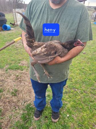 I have one game heny and a game hen with rooster feathers don't no bloodline located in southwest city mo 64863 text 417- two seven nine-21 nine eight not free