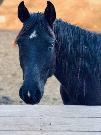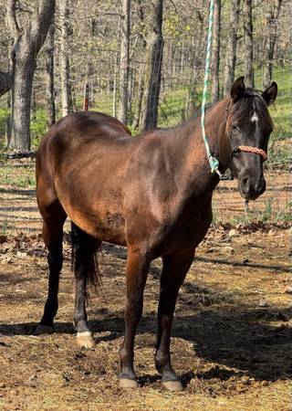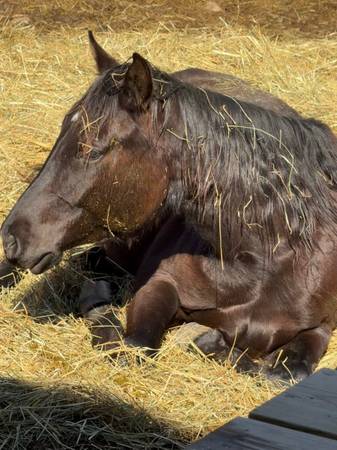 Coggins says black (sun-bleached bay) Quarter Horse gelding. About 15hands. Easy keeper, good minded, little stubborn, just green.