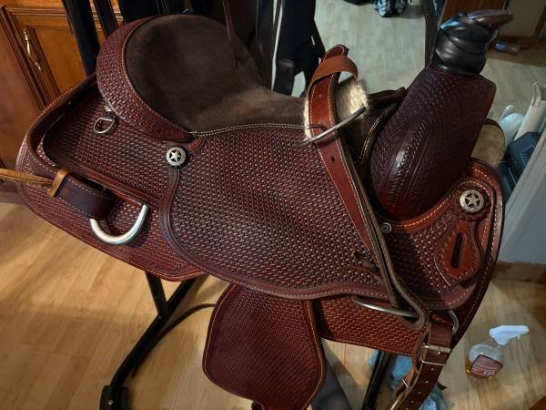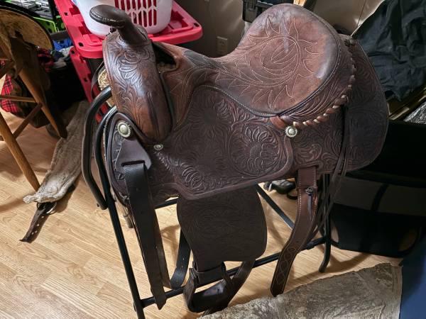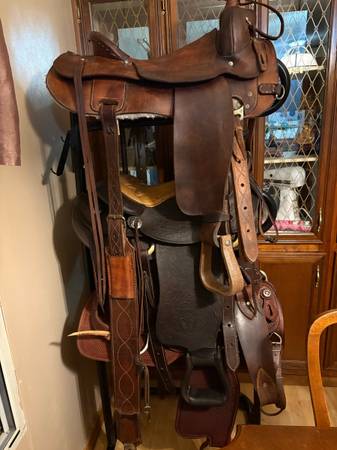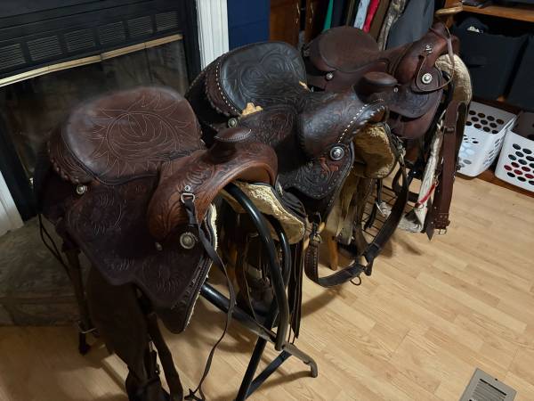 Selling all 6 of my saddles as a lot for $1200. IJust sold all my horses. Three Herefords. Two in great shape, the third isn’t. One is a Saddle King of Texas in good shape, one is made by Ron Pingleton of Alton Mo, the last one is a Clark I believe. Selling as a lot. Buy them all and sell what you don’t want. Unsure of sizes except the Clark is a 16.5. I’m 6’ 190lbs and they fit me well. 8seven0 six88 four 1 three 8. Text me. If you call leave a message. Located in Yellville Arkansas. Only trading would be for a vehicle, Atv, motorcycle, or pew pews. Racks go with them.