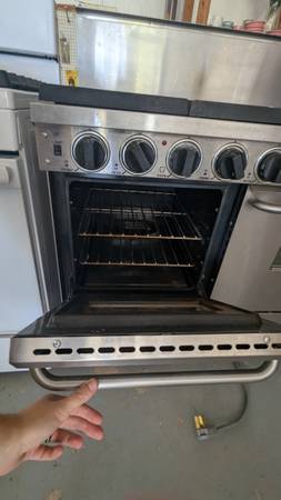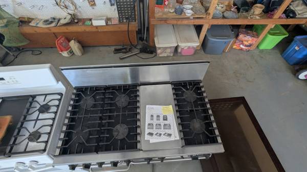 Six burners two ovens and interchangeable griddle gas and electric works great! must come pick up