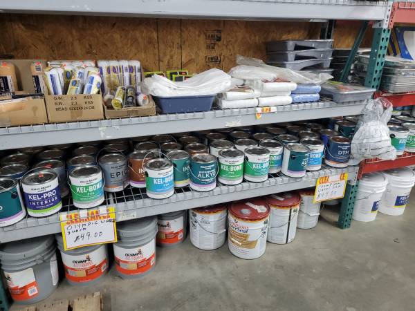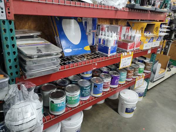 We alsohave lots of paint, spray paint just $4 per can, lots of colors and types of paint, water proofing, paint supplies, tools, trowels, tarps, gloves and buckets, all the tools needed to do the job.