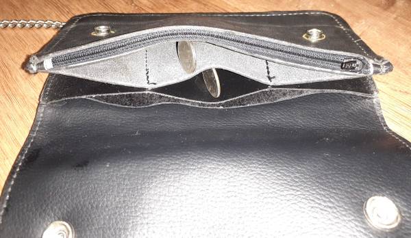 Genuine leather trucker wallet. Made in USA. Multiple pockets. Zipper pouch for coins, etc. Belt chain. Never used, in excellent condition.