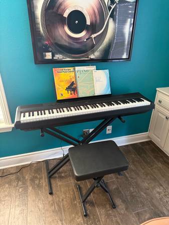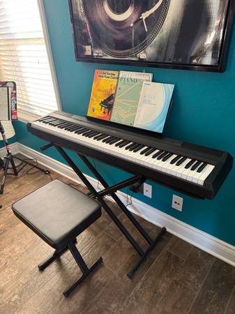 The Yamaha P-115 Digital Piano is an 88-key digital piano that is weighted and can split. It has full-sized keys and a realistic response and sound.
