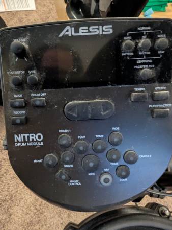 Alesis Nitro Mesh electronic drum set. Sends sound to your own headphones or speakers. Great for practicing at home without bothering the other folks. You can also use a usb cable to hook it into your computer for more drum sound options, or to use as a midi trigger for your DAW.