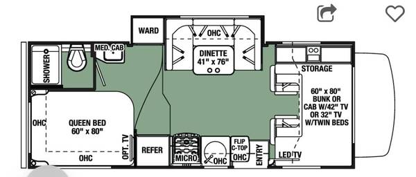 Cab with AM/FM/CD/bluetooth /rear camera * 24 feet 6 inches exterior * drives easy * parks easy *set up easy * Cold air conditioner * Propane heater * 30amp service with appropriate cords * Generator runs on Propane * "Solar ready" hook up (no panels installed) * Sleeps 5-6 * Slide-out dinette area with recent re-upholstery in denim patchwork * Overhead bunk or storage * Rear 60x80 queen bed * Medicine cabinet and sink separate from toilet and shower area * Convenient intuitive kitchen layout * full size 3-way fridge/freezer * 3 burner propane stove with oven * microwave * deep sink * spacious cabinets and drawers * Closet with lighting * Coach has TV/DVD AM/FM/CD with remotes * Electric awning with LED lighting and audio speakers * Abundant exterior cargo space
