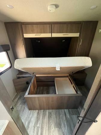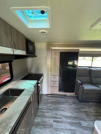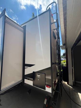 The exterior of the trailer is just as impressive as the interior, with a durable construction that is built to last. The sleek design and stylish accents make this trailer stand out on the road, while the practical features such as storage compartments and outdoor lighting make it easy to set up camp wherever you go.