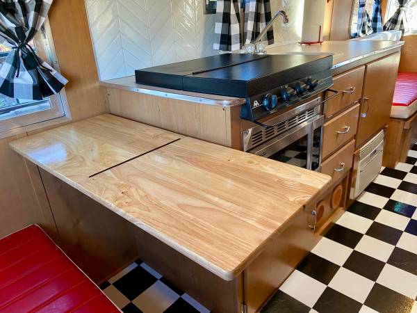 Custom built fold down shelf in back of camper