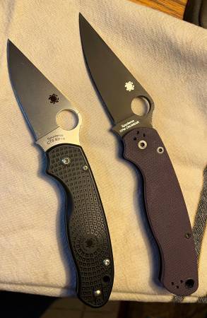 Excellent condition Spyderco and Kershaw knives. Prices and details below. Email to set up a meeting. Made in USA Spyderco Paramilitary 2 - purple G-10 scales and black DLC coated CPM Cru-Wear...