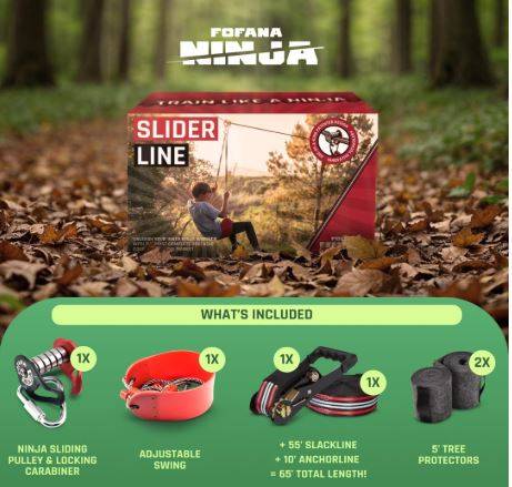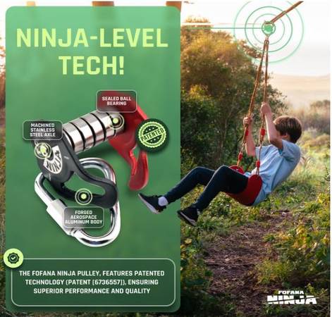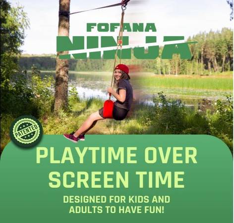 Fofana Ninja 65 Foot Slackline, Slider, Zipline, Swing, Pulley, also includes carrying/storage bag and user manual/set up guide, in excellent pre-owned condition, up for only one season, 3-4 months, all for only $40, currently listed on Amazon.com for $112.83 (new), listed on multiple sites, shipping not available, porch pickup off Rupple/Weir, Fayetteville, AR, cash or Venmo. Thank you so much for looking!!