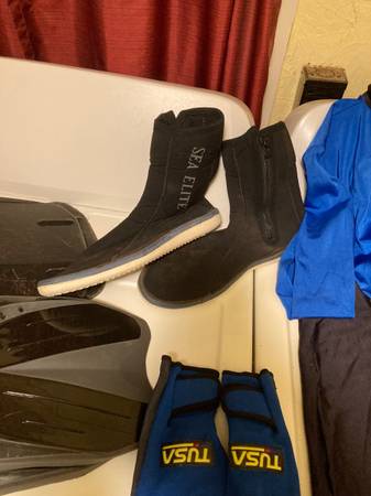 C SPORTS Wet suit x - large nylon / Lycra , gloves , boots , 1pair lg. long fins 1 pair short fins medium.