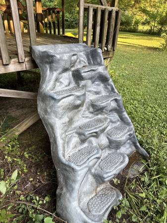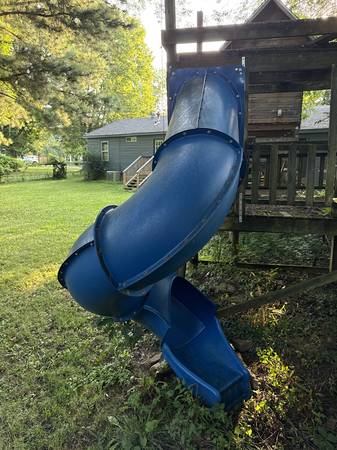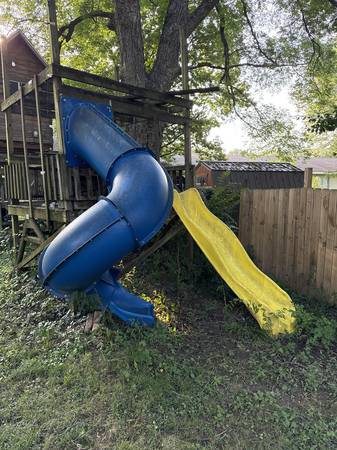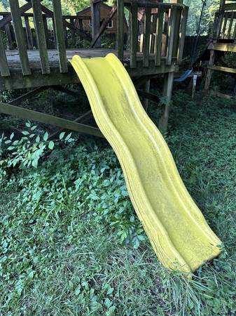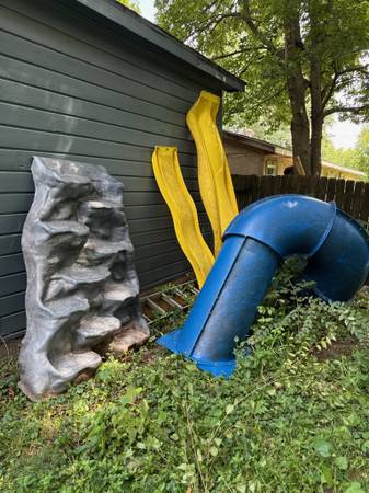 2 yellow slides, a gray 'rock' climbing wall and a large blue twisting blue slide. Good condition, although the blue slide will need to be cleaned just from being outside. You will need to pick up...