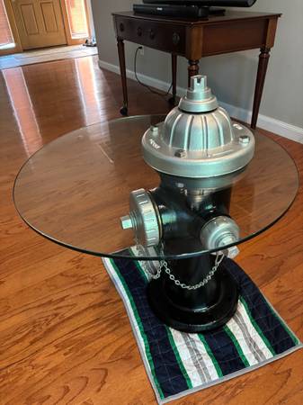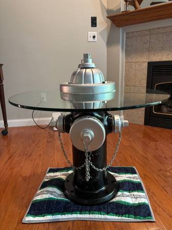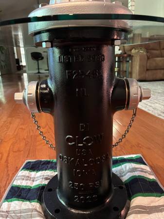 Genuine one of a kind fire hydrant table. This is a retired 2022 fire hydrant that I had sandblasted and repainted. The glass is 3/8 of an inch thick tempered safety glass and is 28 inches in diameter. All parts and pieces are original to the hydrant (except for the glass of course). This is very heavy and I can assist with disassembly. It comes apart very easily and makes moving it much easier. Suitable for indoor or outdoor use.