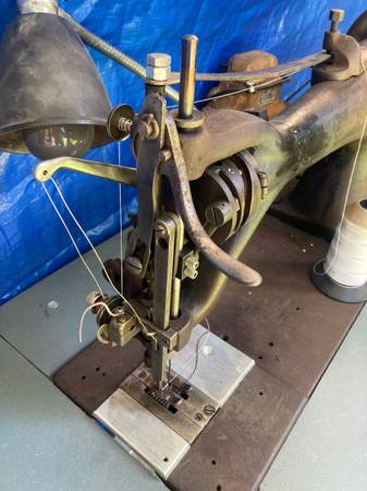 Stitch length is adjustable, currently set at 4/inch. 1/2” of leather, with fabric needle, sews like butter. One photo compares it to a current Singer “heavy duty” machine.