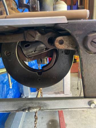 The original motor, mounted behind the column, drives the handwheel with a flat belt, and the foot pedal activates the clutch or brake to control machine speed.