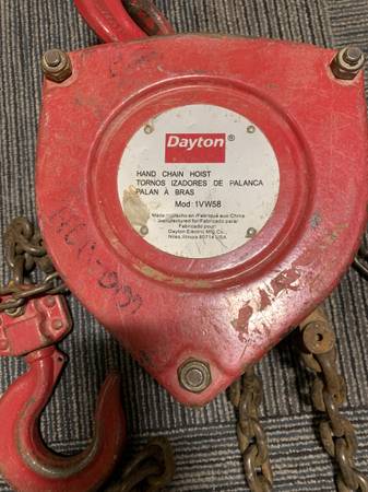 Have a used manual Dayton chain hoist. Can lift up to 4000 pounds. $50. Call John at 4seven9 six4zero 2six9four Calling is best. Please don't ask if it's still available.